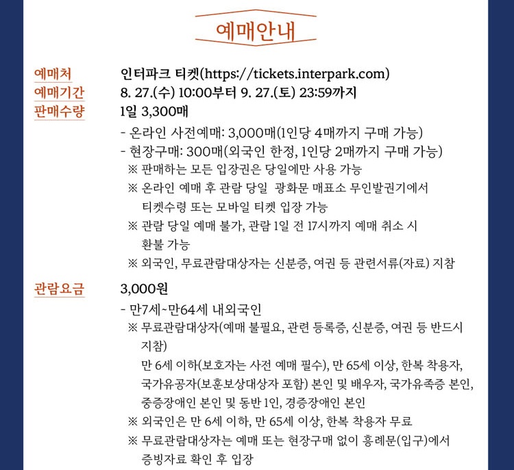 무료입장 대상자(만 6세 이하, 만 65세 이상, 한복 착용자 등)는 예매 없이 신분증 지참 후 현장 입장 가능합니다.