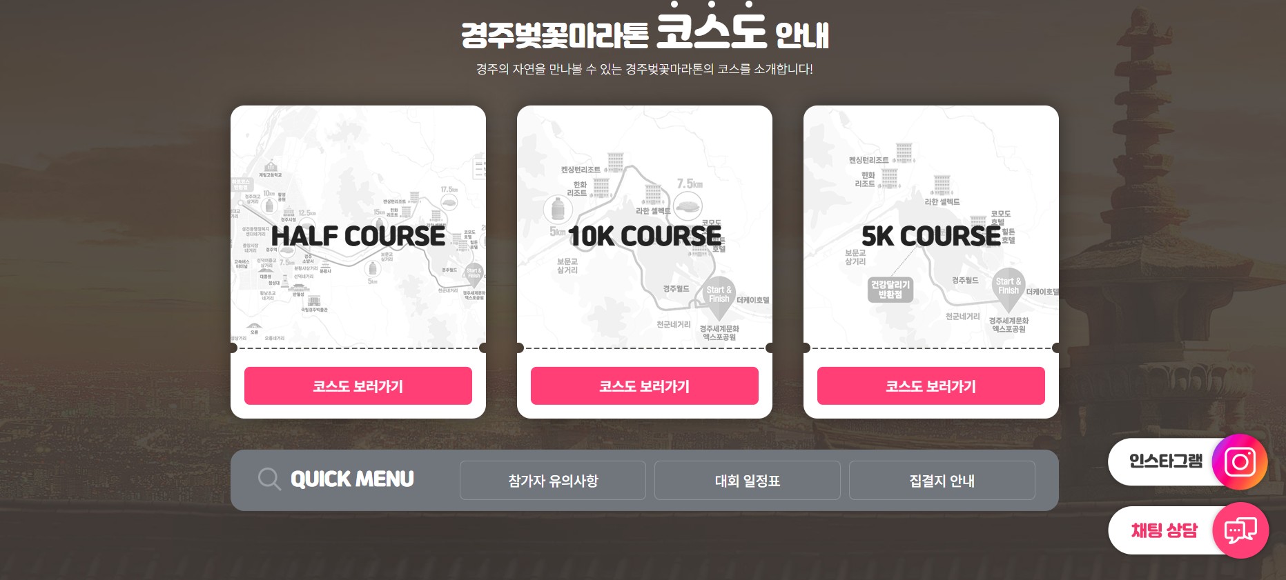 참가 코스는 하프, 10K, 5K로 구성되어 있으며, 각 코스별로 접수 일정이 다릅니다. 선착순 접수이며, 조기 마감될 수 있습니다.