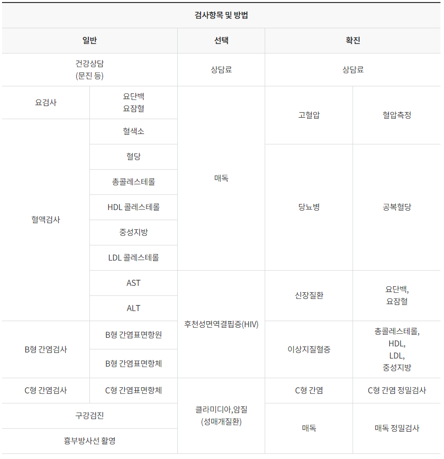 - 기본검진 : 상담 및 진찰, 신체계측, 요검사, 혈액검사, 구강검진, 영상검사 등