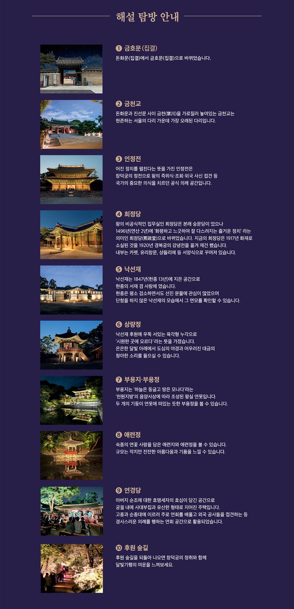 부용지, 애련정, 낙선재, 희정당 등 고즈넉한 공간들이 포함됩니다.