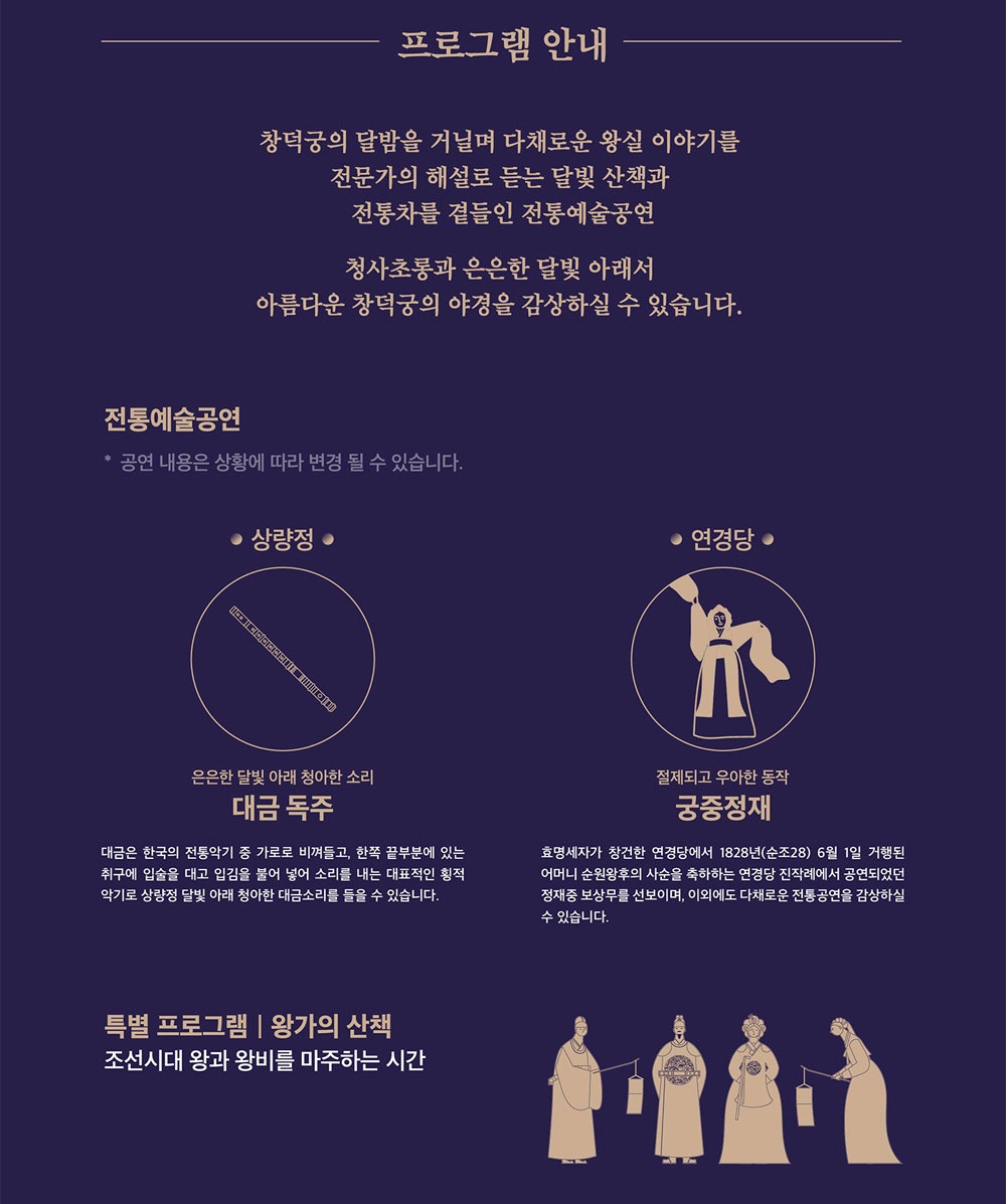 조선 왕들의 사랑을 받았던 창덕궁을 달빛 아래에서 거닐며 해설사와 함께 왕실의 이야기를 듣고, 전통예술공연도 즐길 수 있는 특별한 시간입니다.