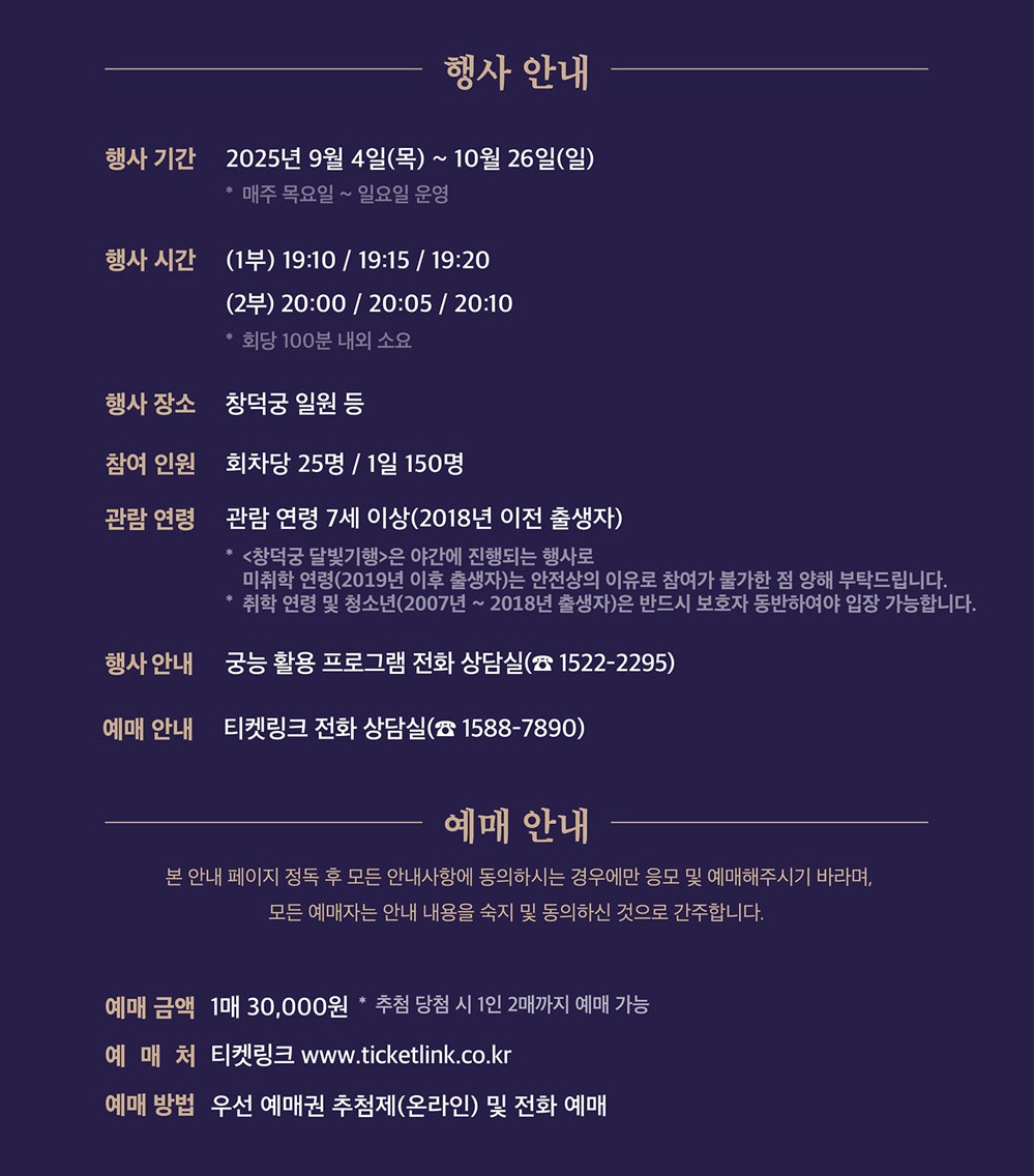 2025년 9월 4일부터 10월 26일까지 매주 목~일요일, 창덕궁에서 진행되는 야간 문화 행사입니다.