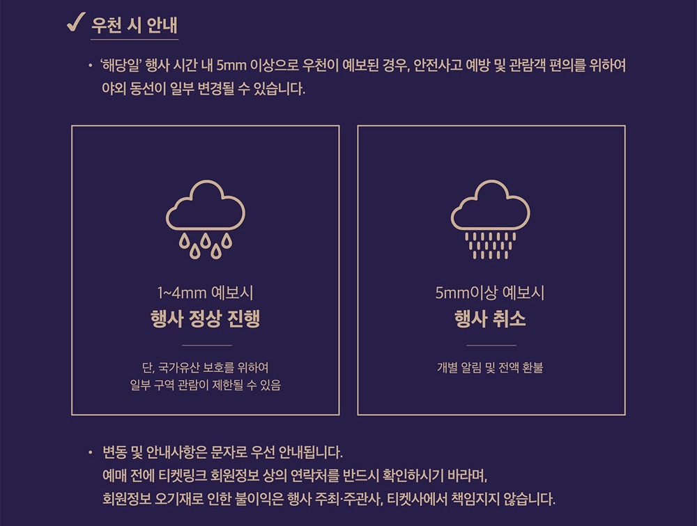 - 5mm 이상 우천 예보 시 행사 취소 및 전액 환불