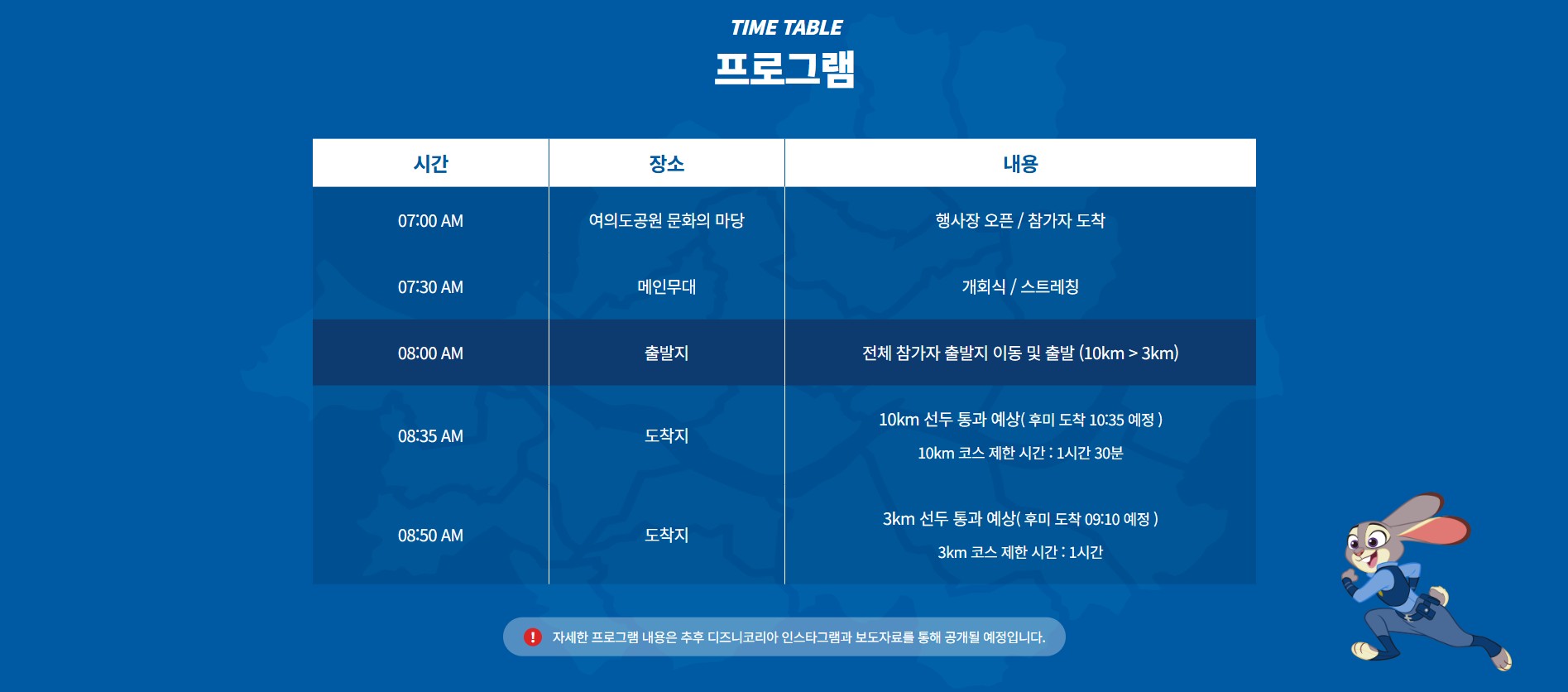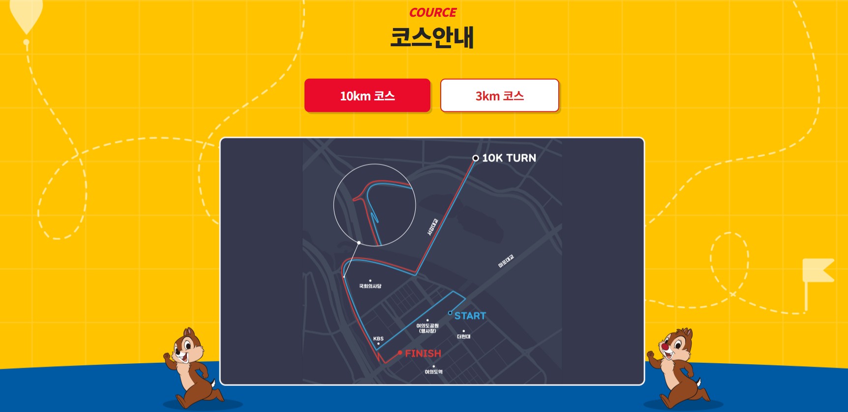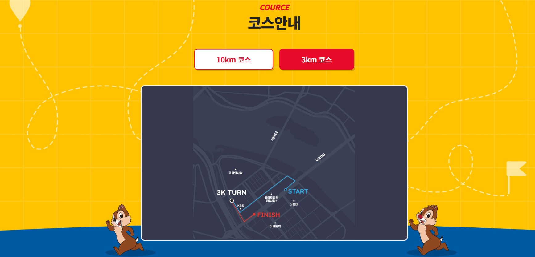 - **10km**: 미키와 친구들을 테마로 한 코스로, 시간 제한은 1시간 30분