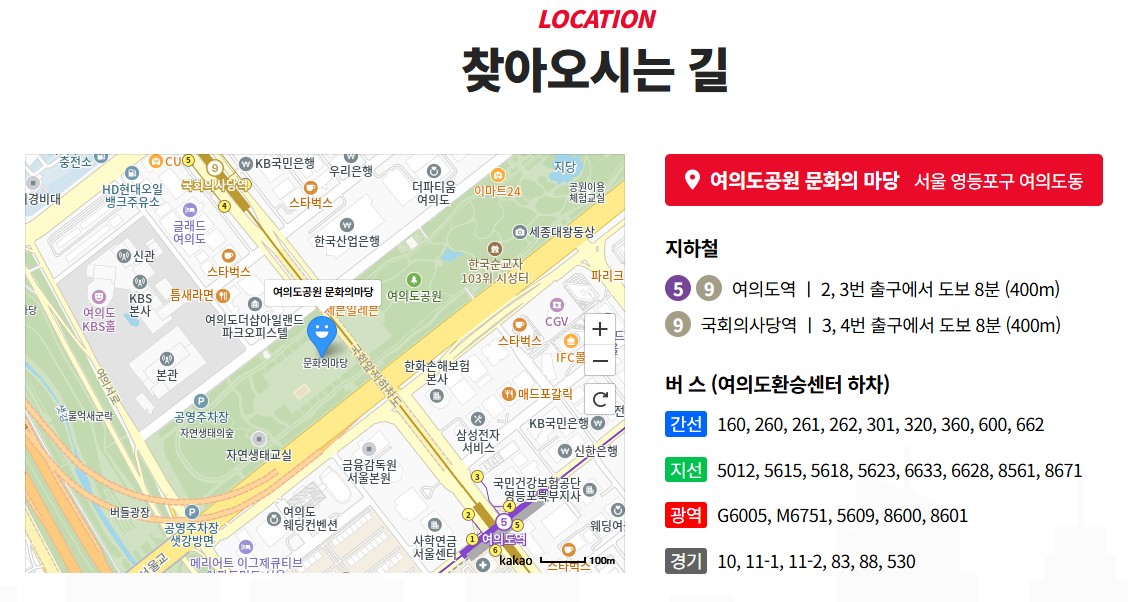 버스는 여의도환승센터에서 하차 후 도보 이동하면 쉽게 찾을 수 있습니다.
