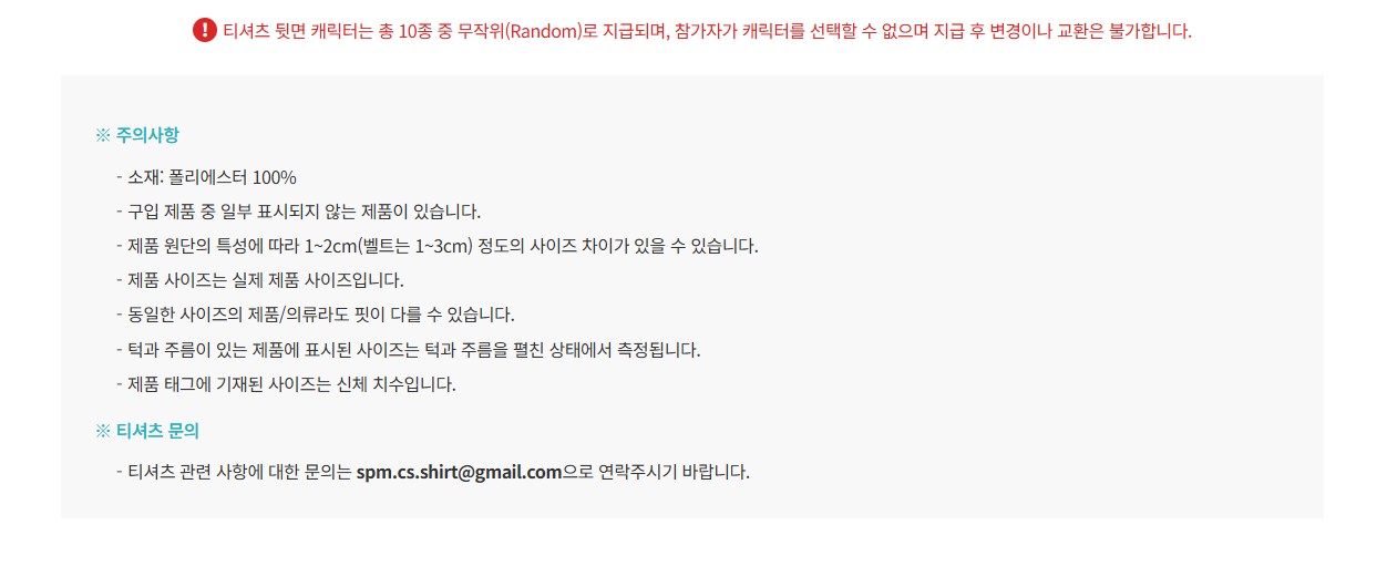 티셔츠는 폴리에스터 100% 소재로 제작됐으며 사이즈는 S부터 XXL까지 선택할 수 있어요. 단, 캐릭터는 랜덤 지급이고 교환은 불가하니 참고하세요!