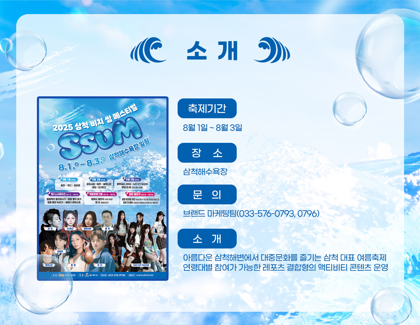 올여름, 강원 삼척에서 열리는 비치 썸 페스티벌에 여러분을 초대합니다! 단 한 번뿐인 여름, 바다와 음악, 그리고 다채로운 체험이 어우러지는 특별한 축제의 순간을 놓치지 마세요. 지금 이 순간이 지나면 내년까지 기다려야 해요! 친구, 연인, 가족 모두 함께할 수 있는 축제 정보를 지금 바로 확인해 보세요.