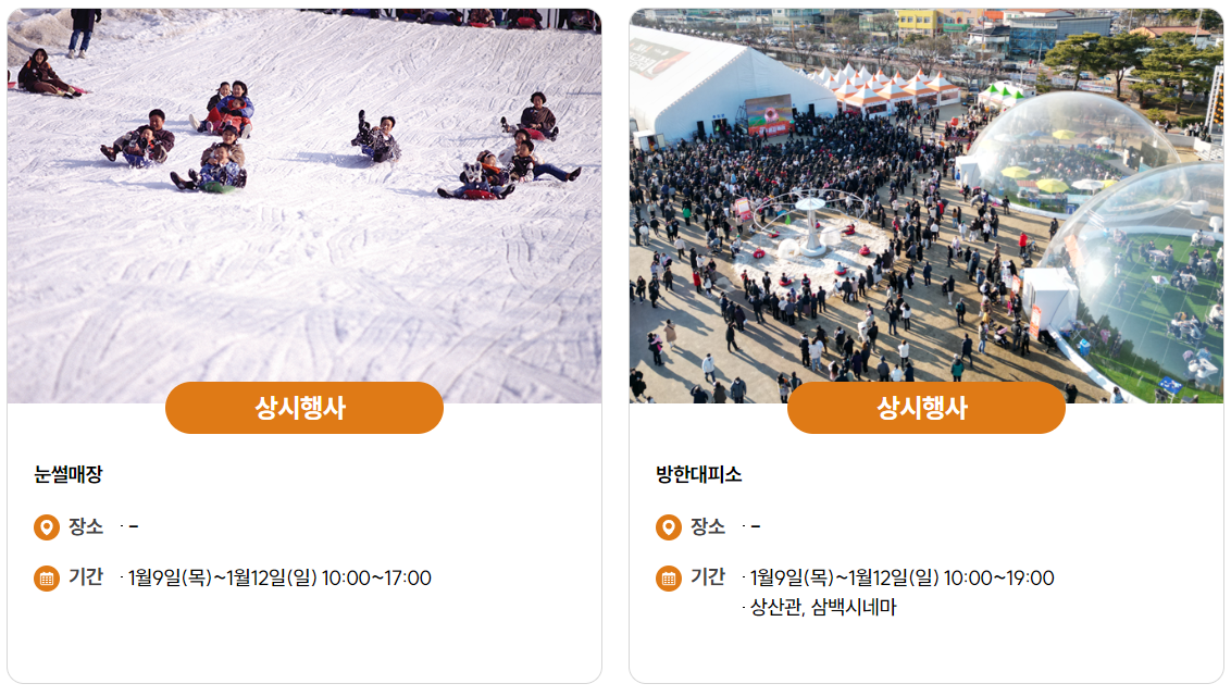 2025년 상주 곶감축제는 1월 9일부터 1월 12일까지 진행됩니다. 이 시기는 겨울철에 곶감이 가장 맛있게 익어가는 시점으로, 축제에 방문하면 신선한 곶감을 직접 맛볼 수 있는 좋은 기회입니다. 축제 기간 동안 다양한 이벤트와 프로그램이 진행되니, 미리 일정을 확인하고 방문 계획을 세우는 것이 좋습니다.