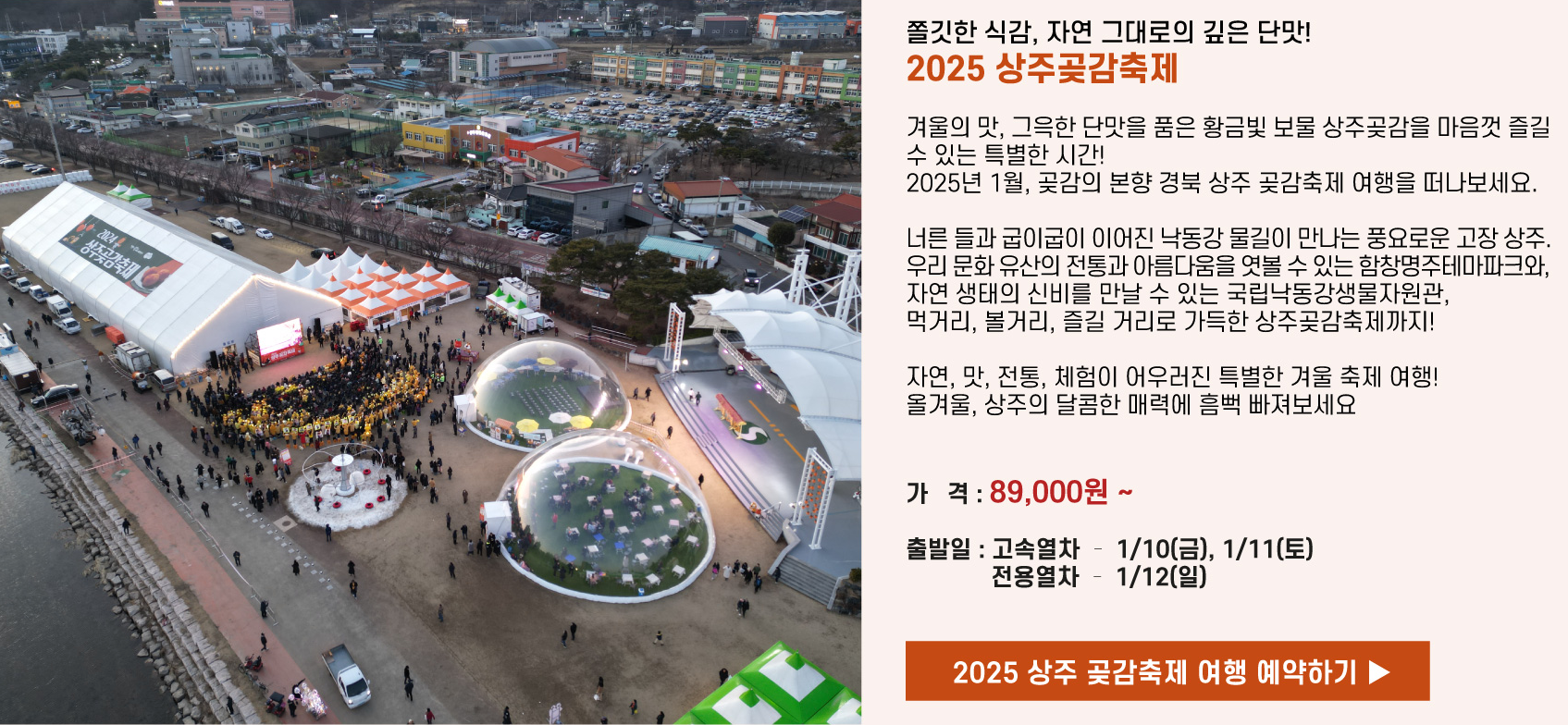 2025 상주 곶감축제에는 코레일과 함께합니다. 코레일에서 이번 상주 곶감축제를 맞이하여 당일 코스로 기차여행을 준비했습니다. 1월 10일과 1월 11일 코스와 1월 12일 코스, 이렇게 두 코스가 운영이 될 예정입니다.