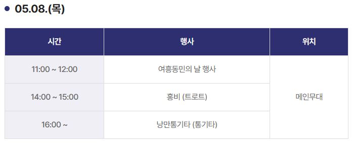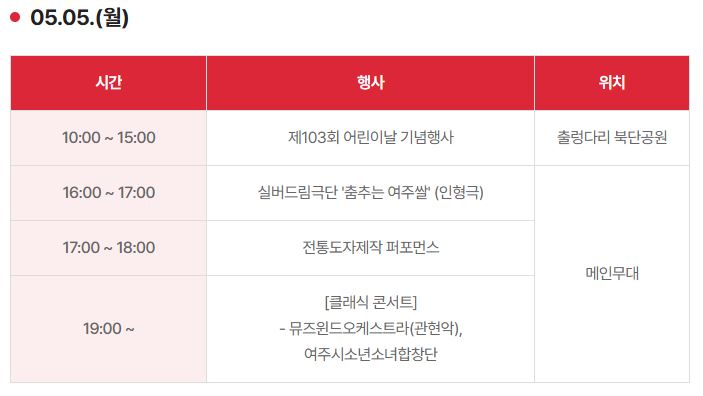 | 5월 5일(월) | 뮤즈윈드오케스트라(관현악), 여주시소년소녀합창단 | 오후 7시~ |