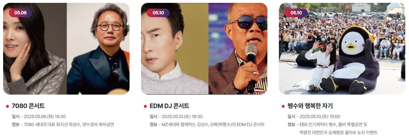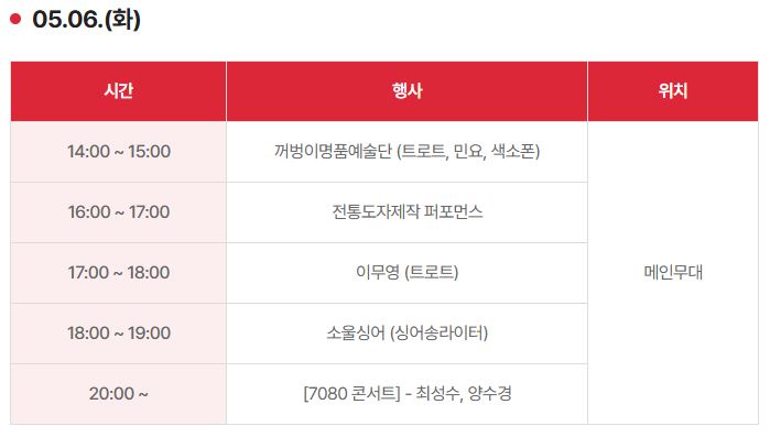 | 5월 4일(일) | 김경민, 왁스, 이찬원 | 오후 7시~ |
