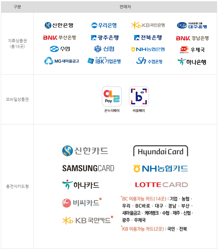 | 새마을 금고, 신협 | 전 카드 사용가능 (단, 카드단말기 설치 지점에 한하여 가능) | 전 카드 사용가능 (단, 카드단말기 설치 지점에 한하여 가능) |