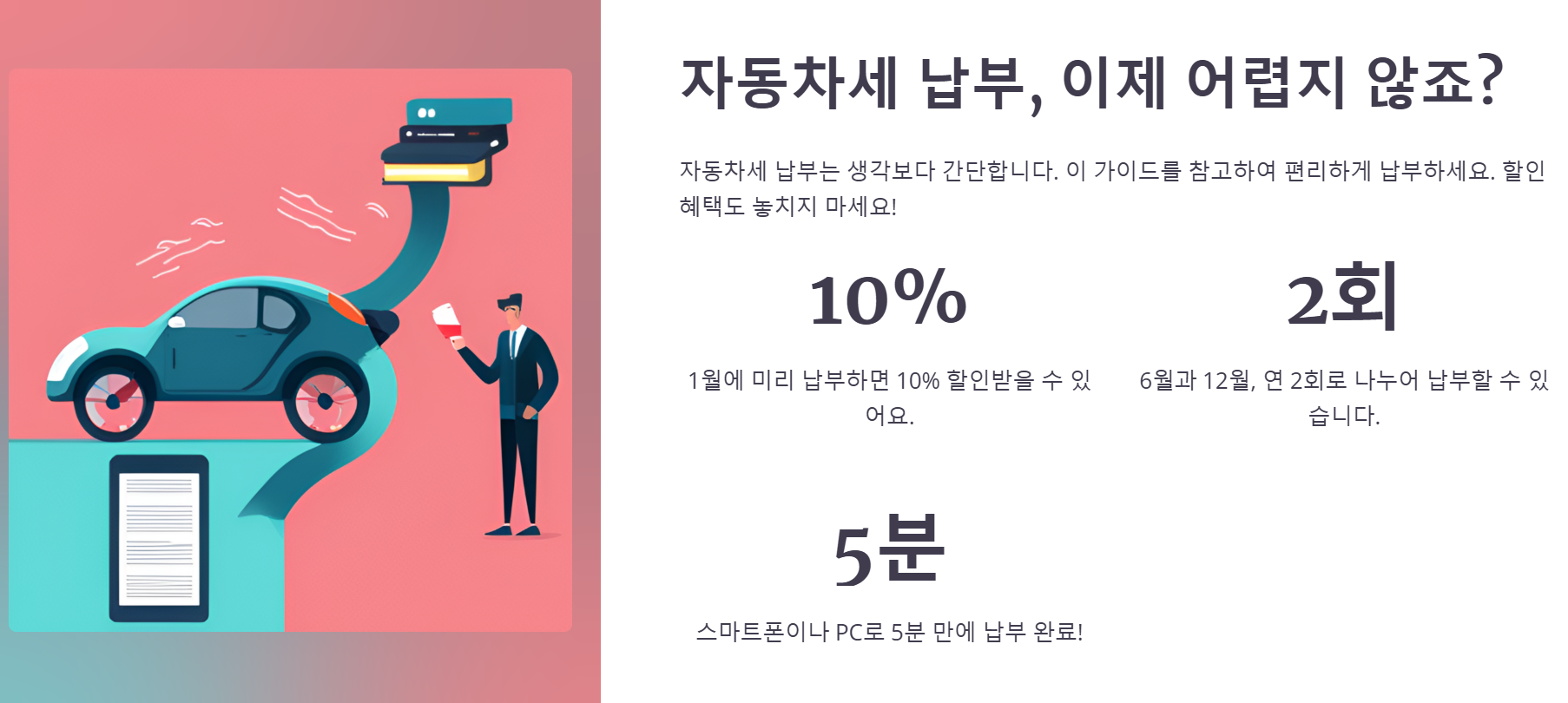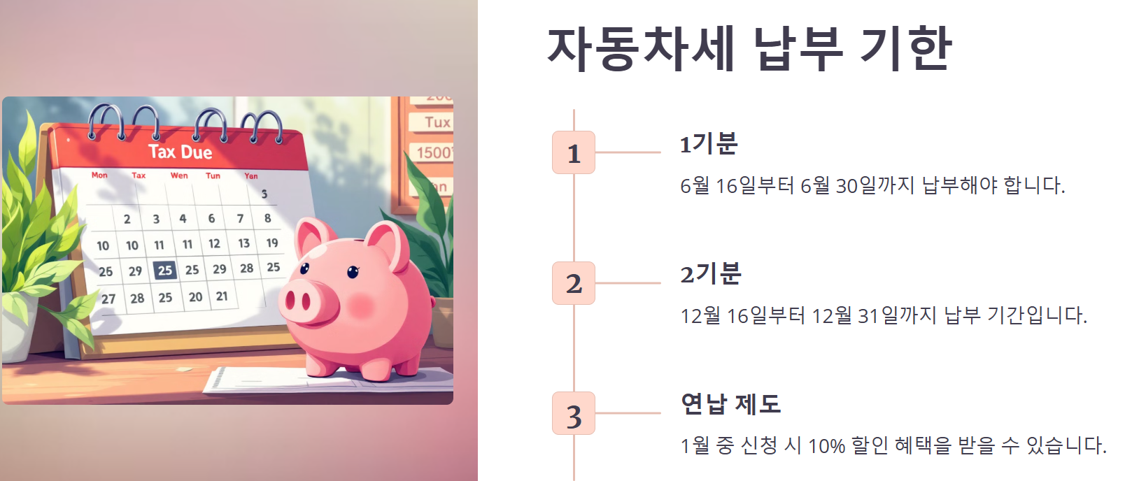 납부기한이나 방법, 할인 혜택 등을 정확히 이해하고 놓치는 일 없이 성실히 납부하여 불이익을 피하도록 합시다.