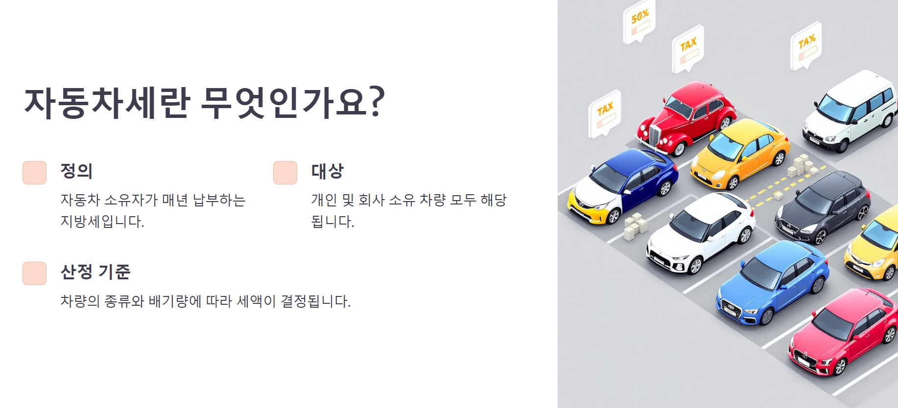 자동차세는 차량 소유자에게 부과되는 지방세로, 자동차의 종류와 배기량에 따라 세액이 다르게 책정됩니다.