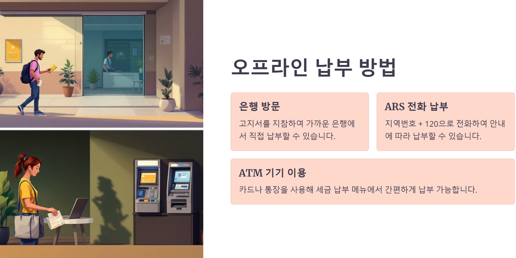 대표적인 방법으로는 인터넷 뱅킹, 모바일 앱, 그리고 고지서를 통한 은행 방문 등이 있습니다.