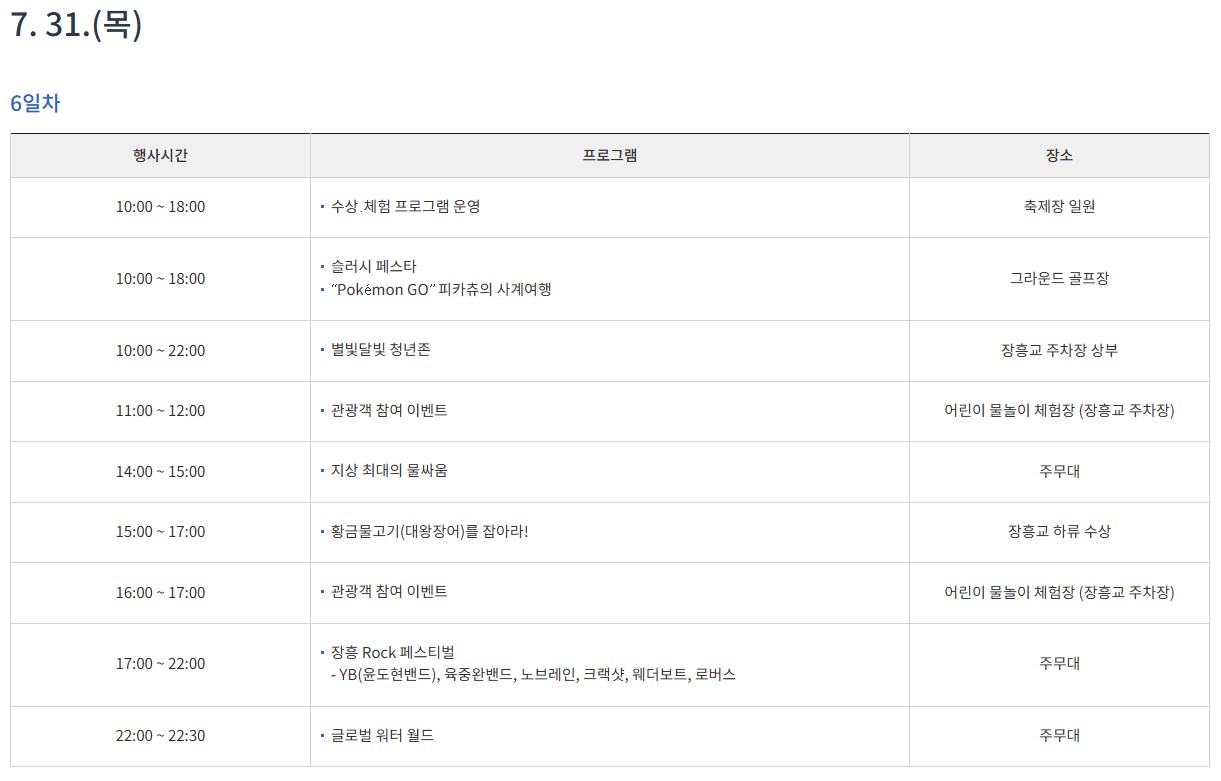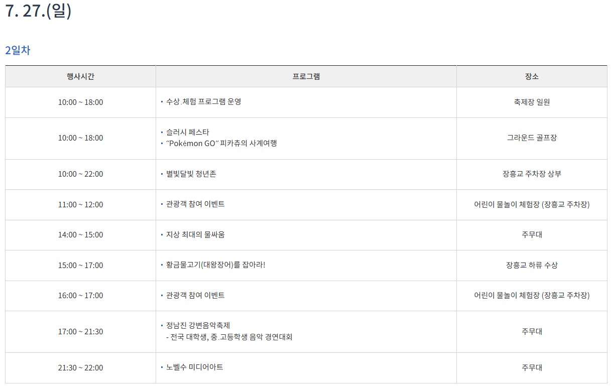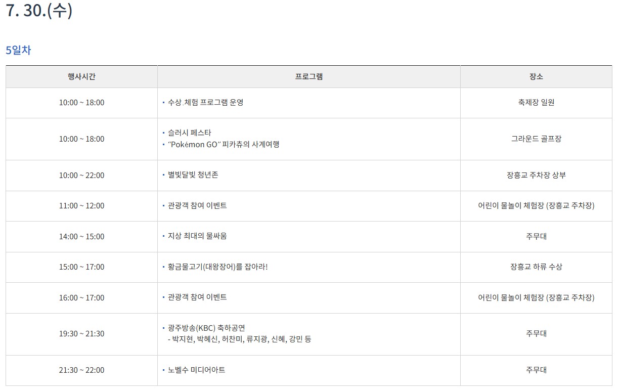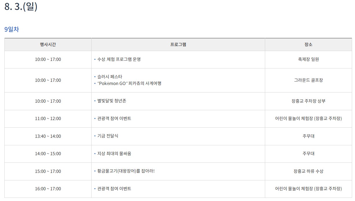 - 매일: 황금물고기 잡기 대회, 지상 최대 물싸움, 슬러시 페스타 운영