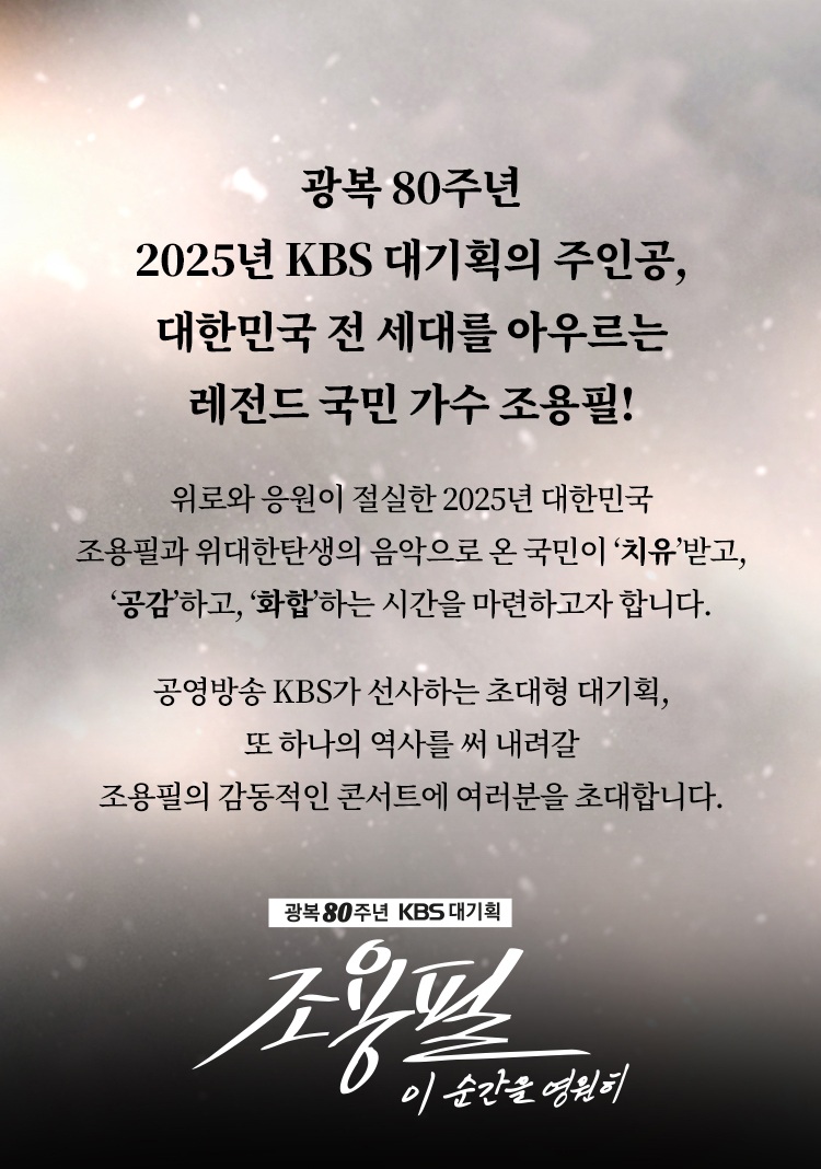 조용필이라는 이름은 더 이상의 수식어가 필요 없습니다. 그의 노래 한 줄만으로 세대를 뛰어넘는 감동을 전해온 그가, 광복 80주년을 맞아 단 하루, 특별한 무대를 엽니다.