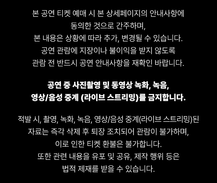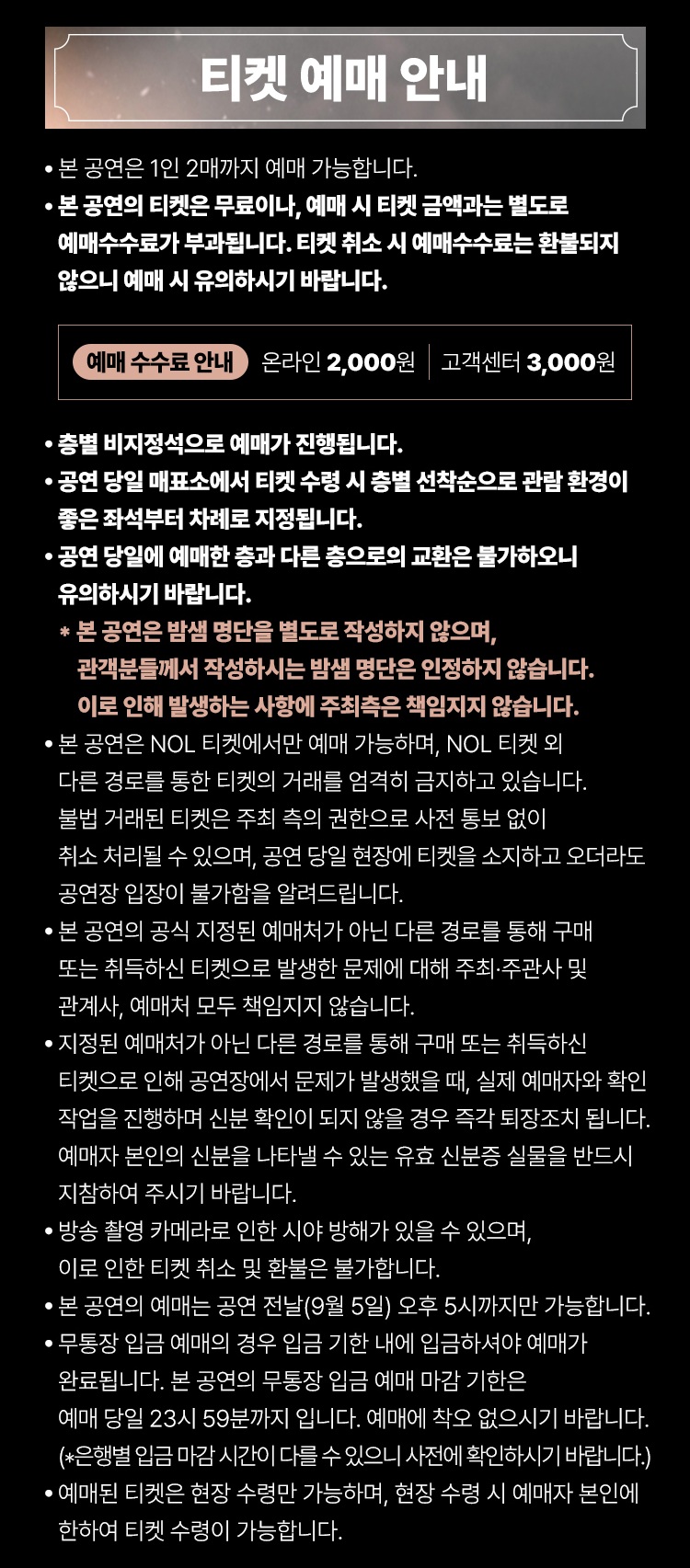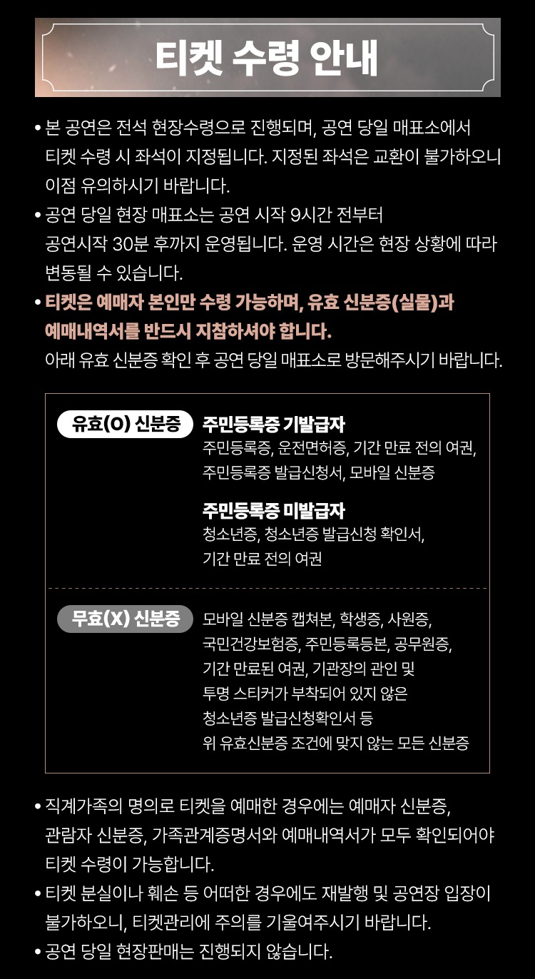 - **공연장 입장은 18:30까지 완료**되어야 하며, 이후 입장 시 빈 좌석 배정 가능