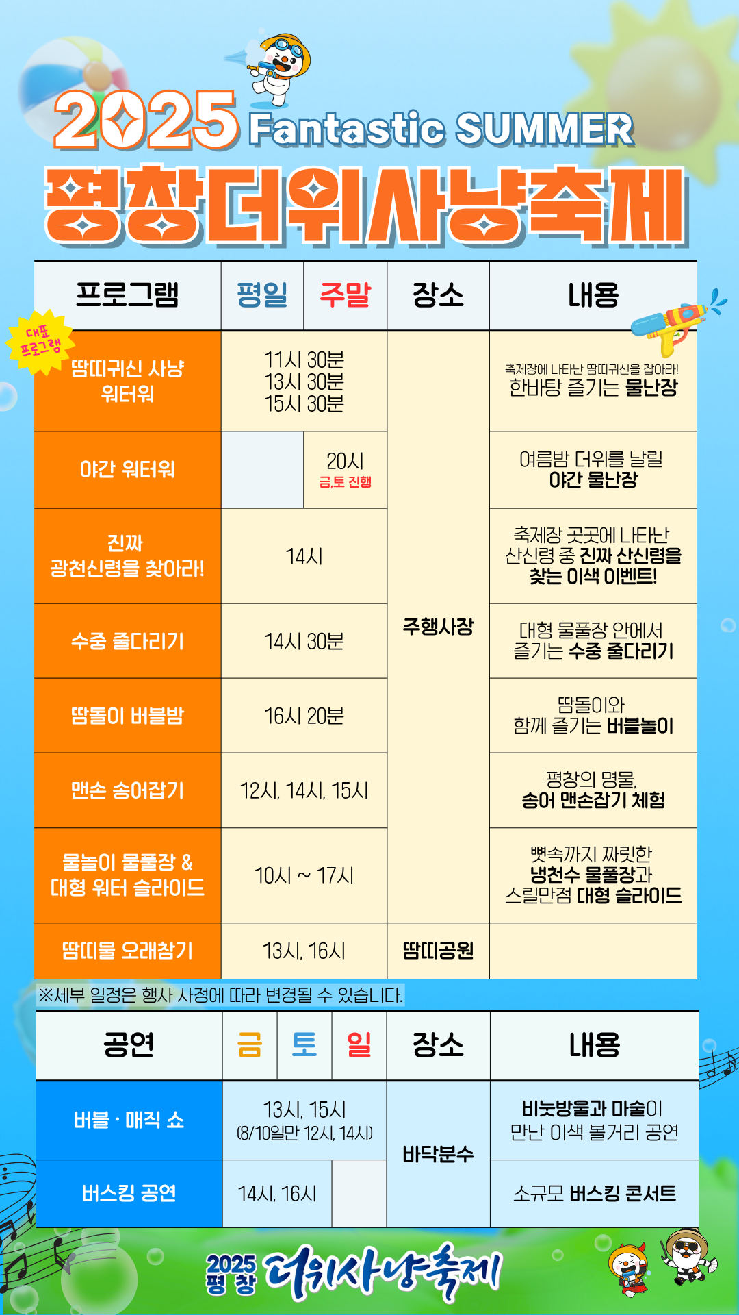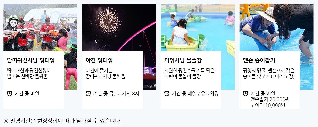 단순히 더위를 피하는 곳이 아닙니다. ‘축제 그 자체’를 즐기고, 다양한 세대가 함께 어우러질 수 있는 공간. 그리고 시원한 물과 웃음이 가득한 여름의 기억. 그게 바로 평창 더위사냥축제가 가진 매력이에요.