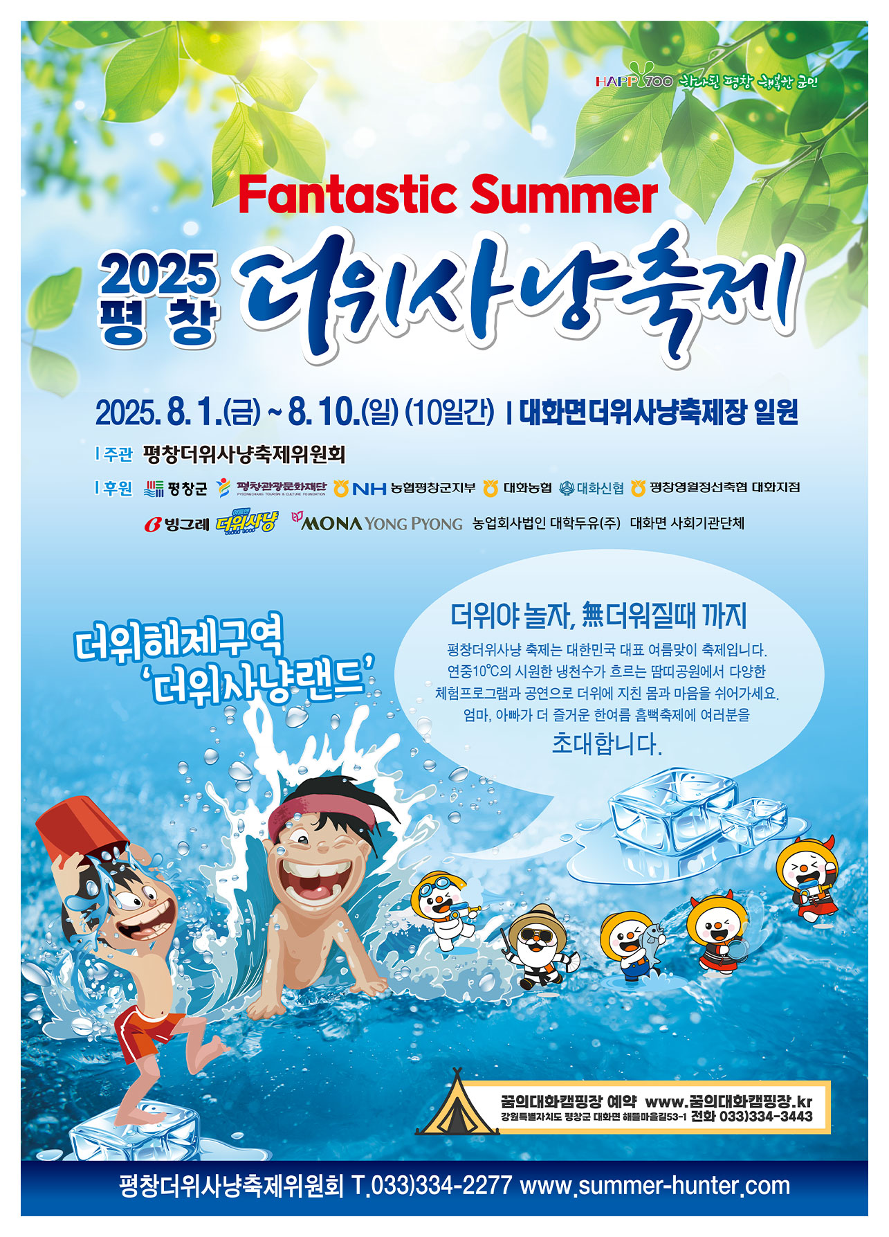 2025년 8월 1일부터 10일까지, 강원도 평창군 대화면 꿈의대화 캠핑장과 땀띠공원 일원에서 열리는 ‘더위사냥축제’는 전국에서 몰려드는 여름 대표 축제예요. ‘땀띠귀신’, ‘광천신령’, ‘EDM 워터워’ 등 이름만 들어도 유쾌한 프로그램이 준비돼 있어 지루할 틈이 없답니다.