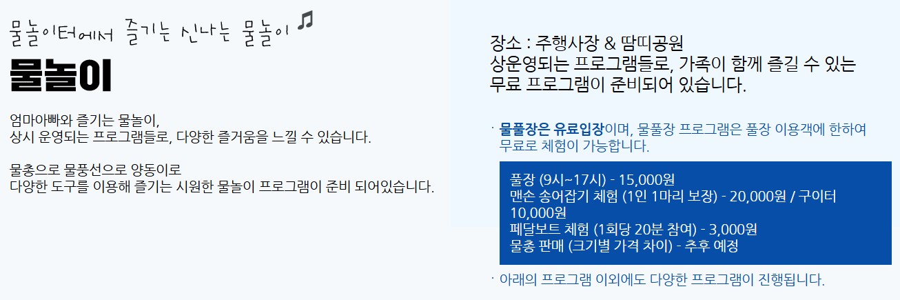 | 물놀이 | 대형 워터슬라이드 | 30m 길이의 초대형 슬라이드 체험 |