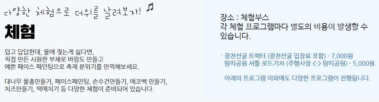 곤충 관찰, 물풍선 게임, 비눗방울 공연 등 아이들을 위한 프로그램이 정말 많습니다. 엄마, 아빠는 족욕과 공연을 즐기고, 아이들은 버블놀이에 푹 빠지는 평화로운 여름날이 상상되시죠?