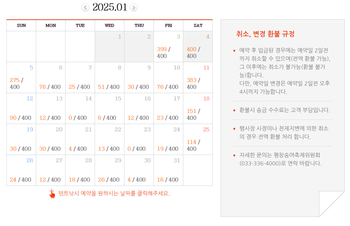- 일 최대 수용인원은 400명이며, 예약현황은 캘린더에서 확인이 가능합니다.