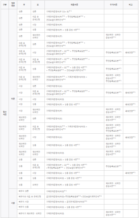 재외국민·외국인 증빙서류: 가족관계증명서로 확인이 안 되는 경우,①재외국민(재외국민 주민등록증, 재외국민등록부등본), ②외국인(외국인등록사실증명, 국내거소사실증명원, 여권사본, 출입국사실증명원 또는 주민등록표초본(주소변경 포함))