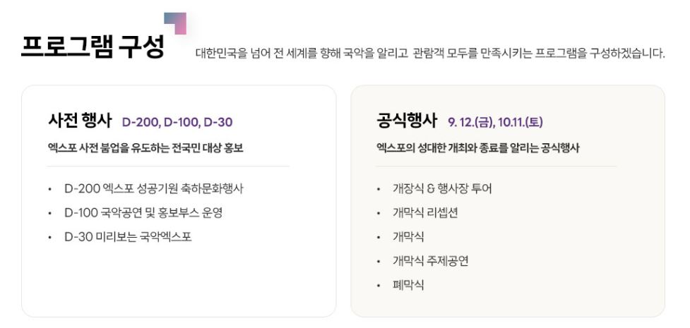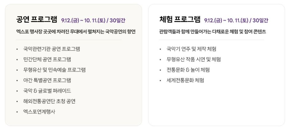 엑스포에서는 다양한 프로그램이 진행될 예정입니다. 국악 공연, 워크숍, 전시회 등이 포함되며, 이를 통해 관람객들은 국악의 매력을 직접 체험할 수 있는 기회를 가질 것입니다. 특히, 다양한 전통 악기를 체험하거나 국악의 역사와 가치에 대한 강연도 예정되어 있어, 국악에 대한 흥미를 더욱 높일 수 있을 것입니다.