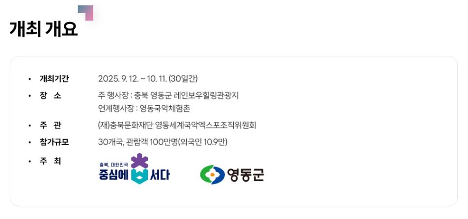 2025 영동세계국악엑스포에 대해 알아보도록 하겠습니다. 이 행사에 대해 많은 분들이 궁금해하실 텐데요, 이번 포스트에서는 행사 개요부터 주요 프로그램, 참여 방법까지 자세히 설명드리도록 하겠습니다.