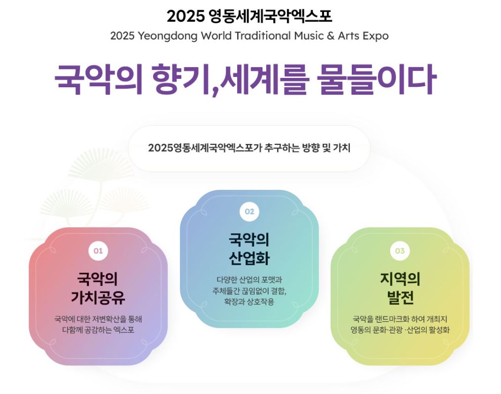 국악을 사랑하는 모든 분들, 그리고 한국의 문화에 관심이 있는 분들은 꼭 2025 영동세계국악엑스포에 참석해 보시기 바랍니다. 여러분의 많은 관심과 사랑을 부탁드립니다.