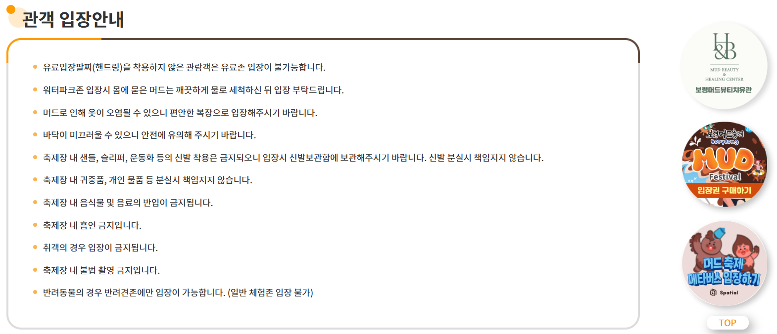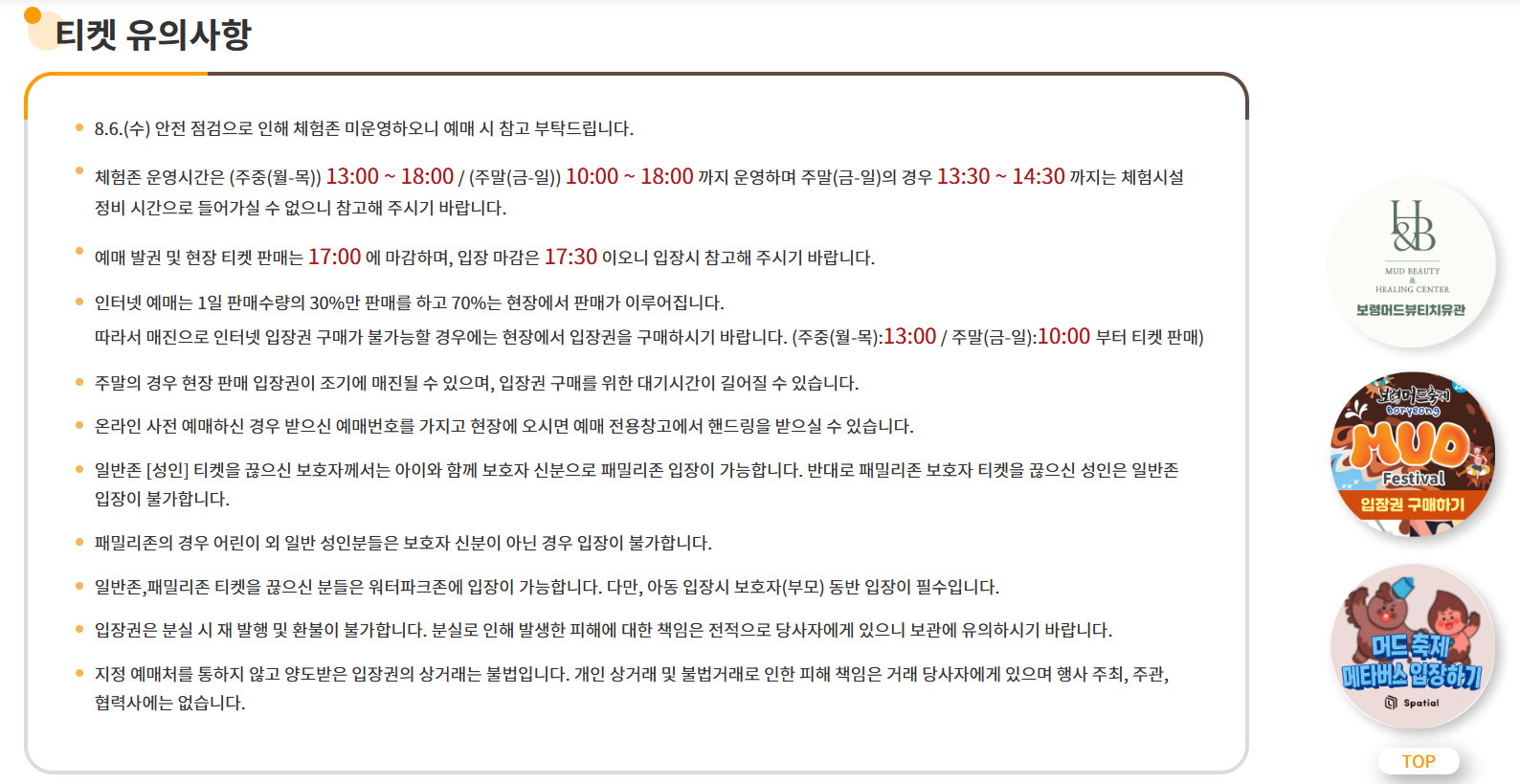 머드 체험존은 주중, 주말로 나뉘어 운영되며 일반존과 패밀리존(키즈존)으로 구분됩니다. 워터파크존도 이용 가능!