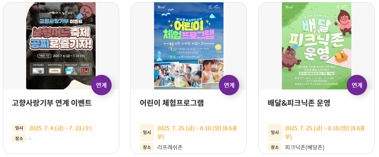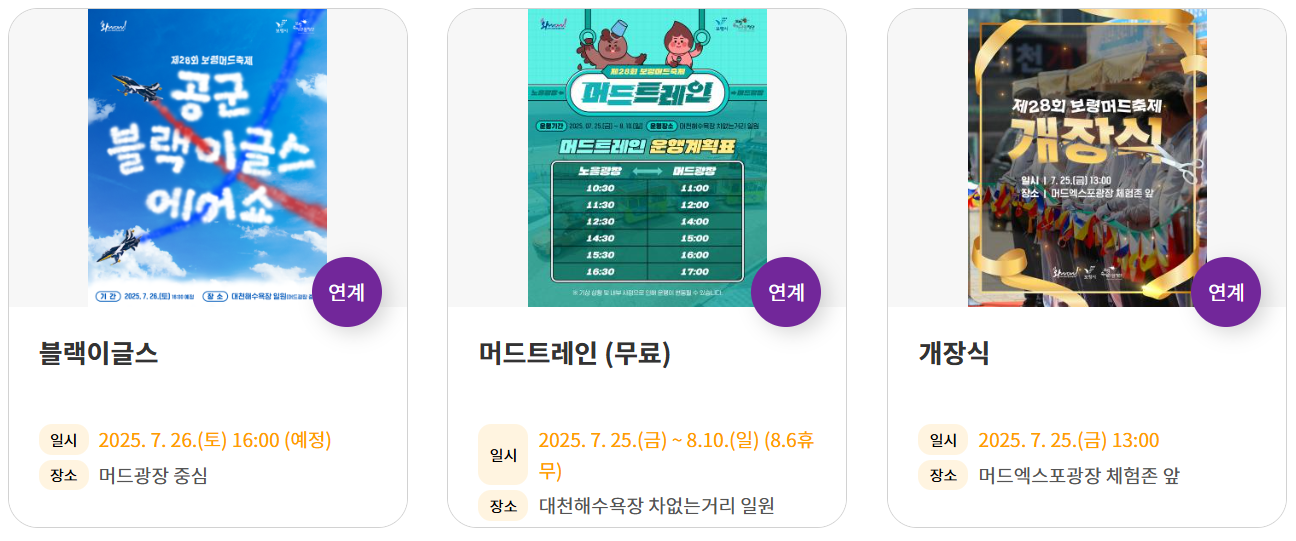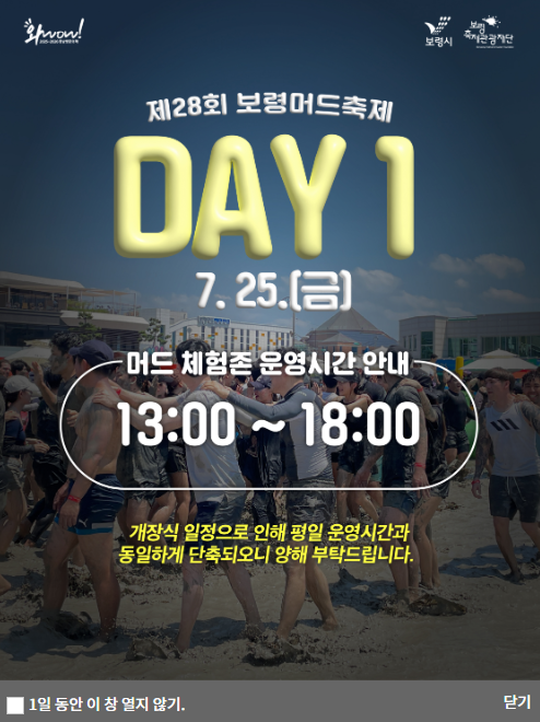 | 7.25(금) | 개막식, 시민한마당, 오픈스퀘어 공연 | 보령종합경기장, 머드광장 |