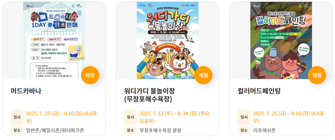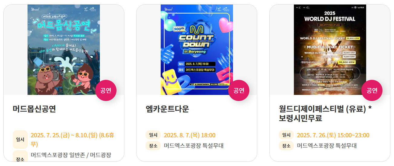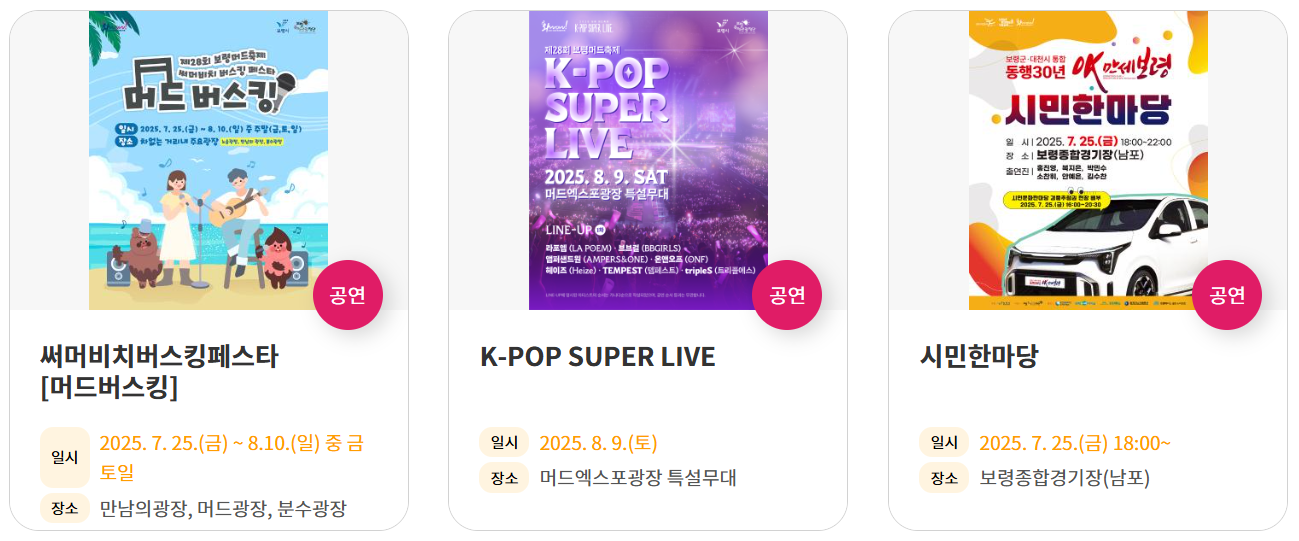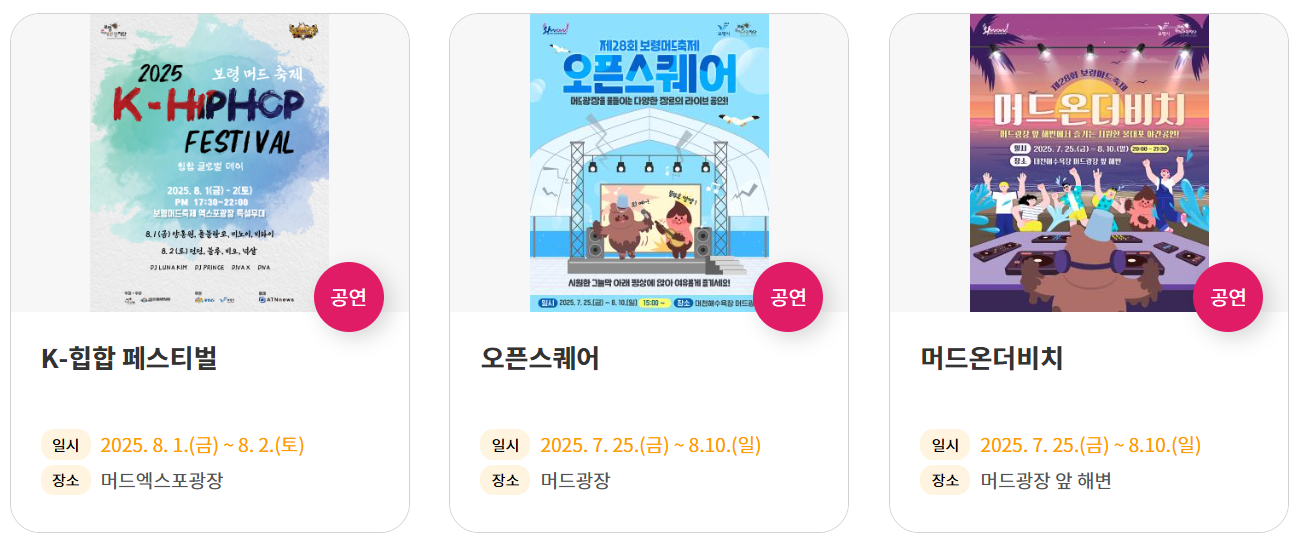 올해는 7월 25일(금)부터 8월 10일(일)까지, 총 17일간 대천해수욕장 일대에서 진행됩니다. 머드 체험뿐 아니라 매일 다양한 공연이 준비되어 있어요. 특히 주말과 공휴일에는 대형 콘서트가 줄줄이 대기 중!