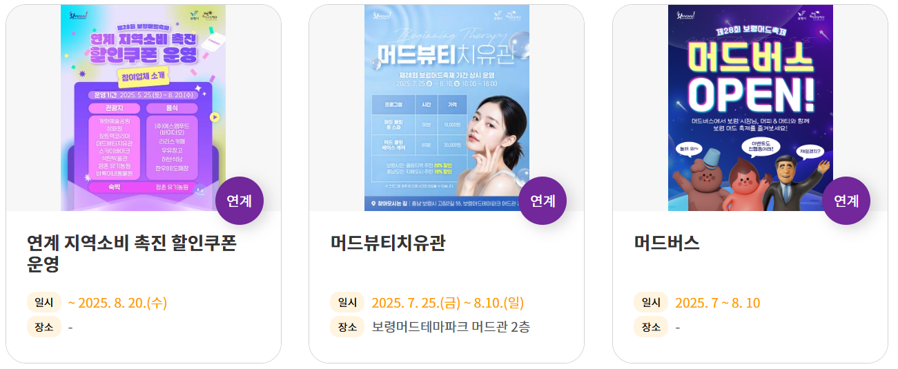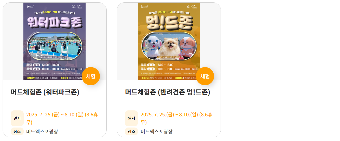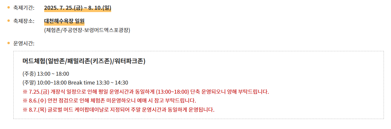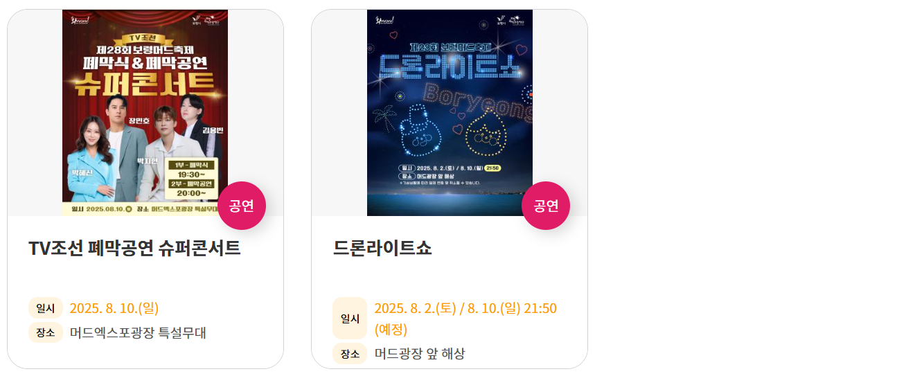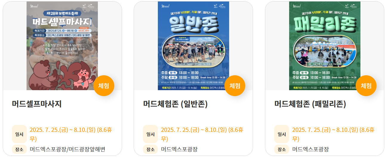 올해는 7월 25일(금)부터 8월 10일(일)까지, 총 17일간 대천해수욕장 일대에서 진행됩니다. 머드 체험뿐 아니라 매일 다양한 공연이 준비되어 있어요. 특히 주말과 공휴일에는 대형 콘서트가 줄줄이 대기 중!