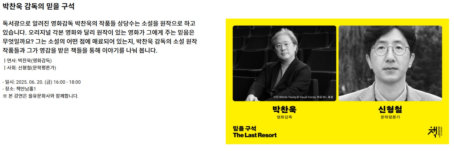 올해 행사에서는 박찬욱 감독, 배우 박정민, 소설가 김금희, 김초엽, 정보라 등 인기 작가와의 북토크가 마련되어 있습니다.