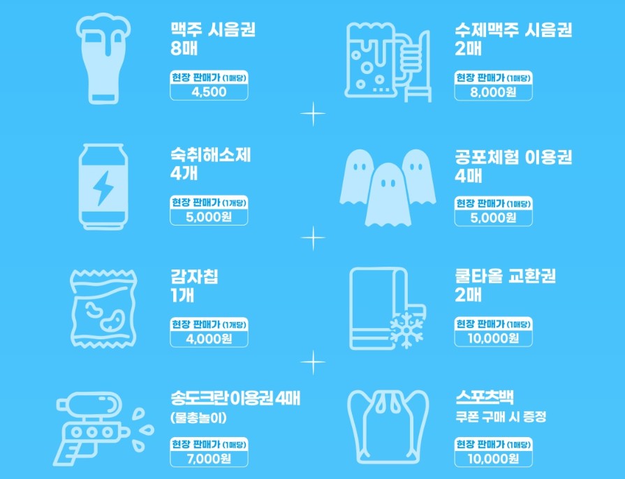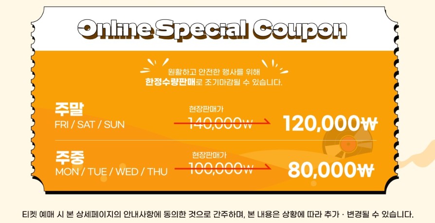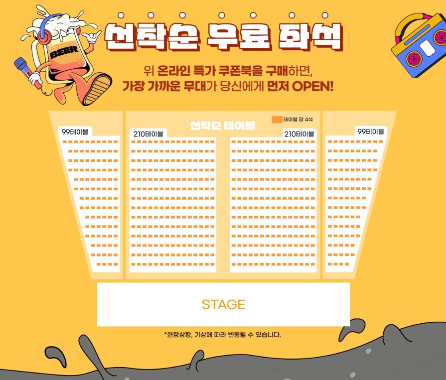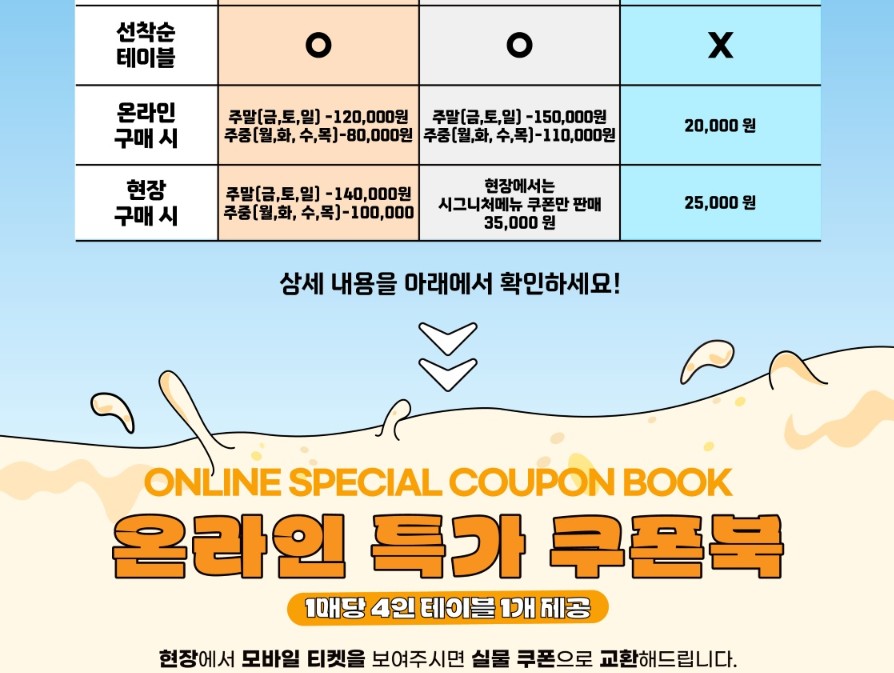 티켓은 미리 사는 게 정답! 특히 온라인 특가 쿠폰북은 4인 기준 테이블 제공까지 포함돼 있어 가격 대비 혜택이 최고입니다.