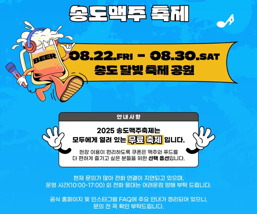 단 한 번뿐인 여름을 특별하게 보내고 싶다면? 2025년 8월, 인천 송도에서 펼쳐지는 '송도맥주축제'가 정답입니다. 'DROP THE BEER!'라는 슬로건처럼, 시원한 맥주와 뜨거운 음악, 그리고 다양한 체험이 어우러지는 이 축제는 더위를 잊게 해줄 단 하나의 선택지입니다. 누구와 가도, 어떤 스타일로 즐겨도 100점 만점의 여름밤을 보낼 수 있어요!