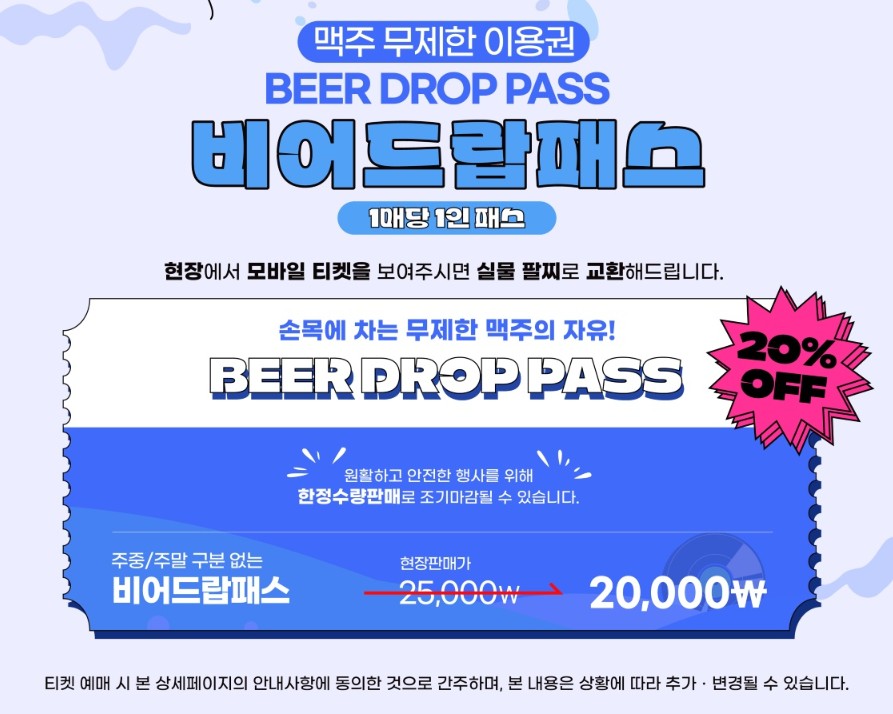 단돈 2만원에 손목에 팔찌 하나면 맥주를 무제한으로 즐길 수 있는 비어드랍패스는 축제 기간 중 가장 인기 있는 아이템입니다. 따로 쿠폰북을 살 필요 없이, 이 패스 하나로도 충분히 맥주를 만끽할 수 있어요. 현장가보다 저렴한 온라인 예매로 놓치지 마세요!