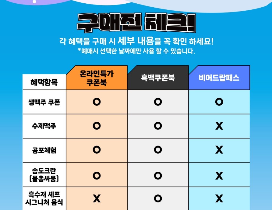 | 혜택 항목 | 온라인 특가 쿠폰북 | 흑백키친 쿠폰북 | 비어드랍패스 |