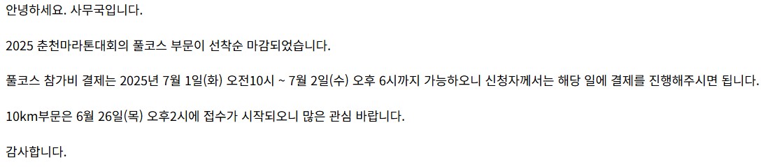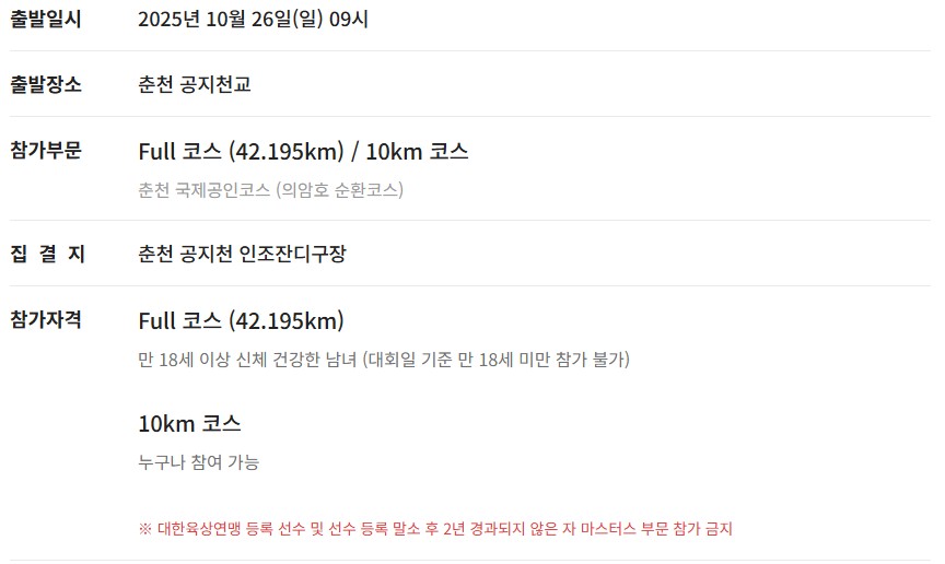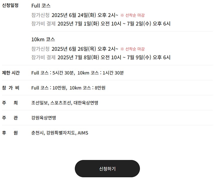 ‘가을의 전설’ 춘천마라톤이 돌아왔습니다. 지금 이 순간, 단 하루의 선택이 당신의 2025년 가을을 완전히 바꿔놓을 수 있습니다. 참가 신청이 이미 시작됐다는 사실, 알고 계셨나요? 참가비 결제 기한도 정해져 있어 미루다가는 늦을 수 있습니다.