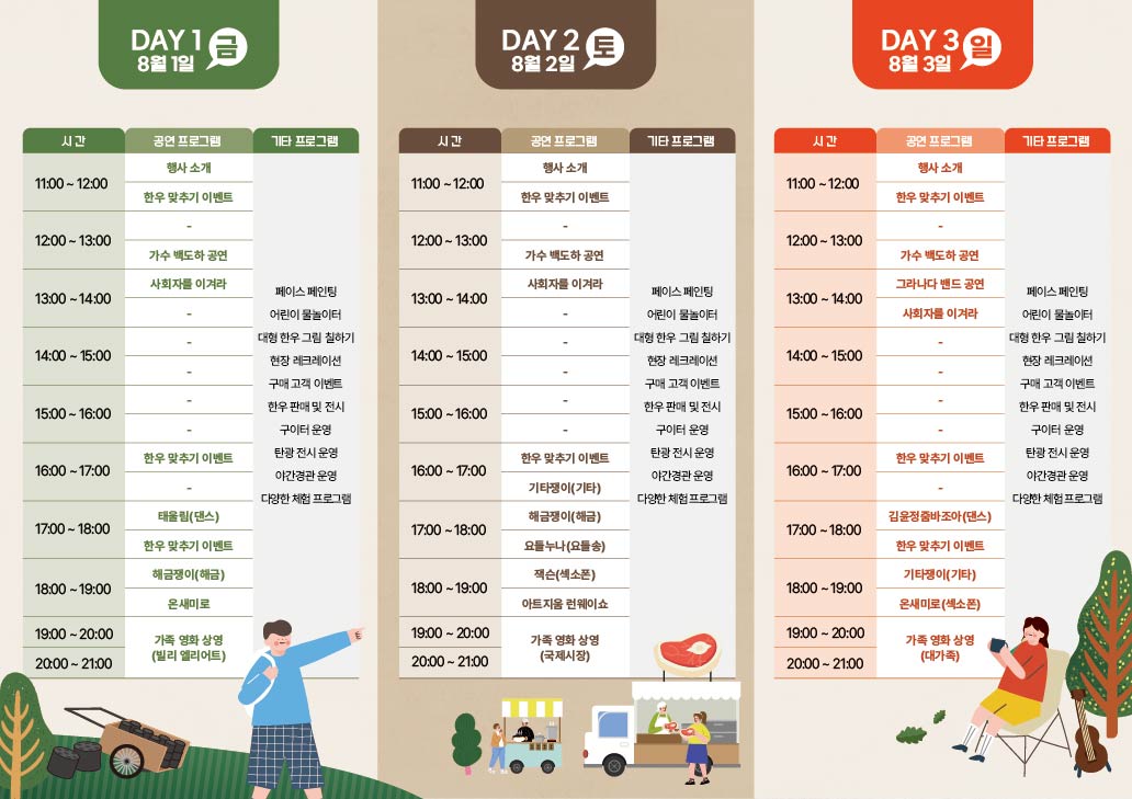 | 16:00~17:00 | 한우 맞추기 이벤트 | 한우 맞추기 이벤트 | 한우 맞추기 이벤트 |